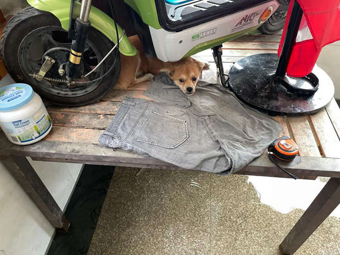 ??????躲在桌子上的小狗。新华社记者 郑梦雨 摄