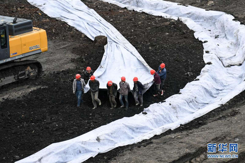 ??????8月16日,救援人员在青海柴达尔煤矿冒顶事故救援现场铺设防渗膜。新华社记者 吴刚 摄